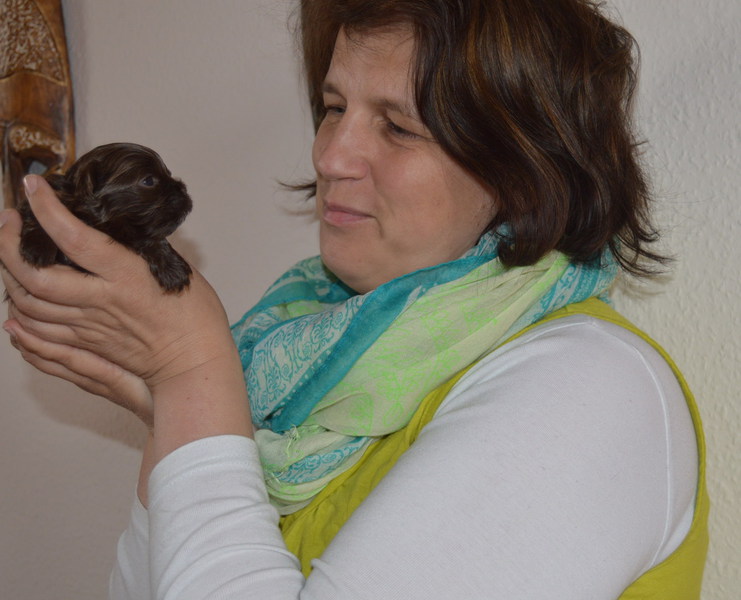 Ihre Zuchttauglichkeit hat sie erfolgreich bestanden. Sie hat ein vollständiges Scherengebiss 6/6. Die Patella - Untersuchung ergab folgenden Befund, beidseits Patella 0/0.