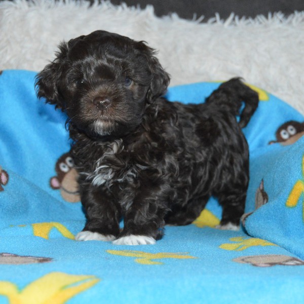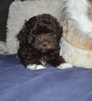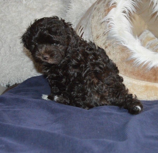 Kleiner brauner Rüde mit weißem Latz, Pfötchen und Schwanzspitze